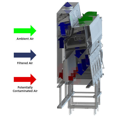 - Exhaust air is double-filtered through high-quality ULPA filters (per IEST-RP-CC-001.3) with typical efficiency of >99.999% for 0.1 to 0.3 micron particles, better than HEPA filters.