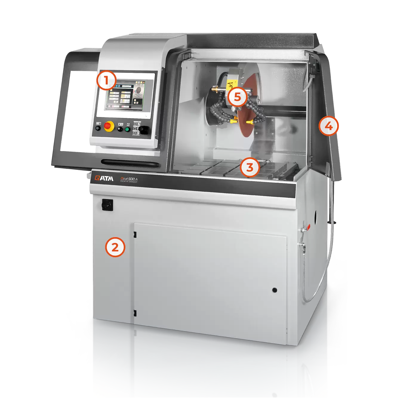 - Large cutting chamber access with safety interlock — doors open only when cut-off wheel is stationary