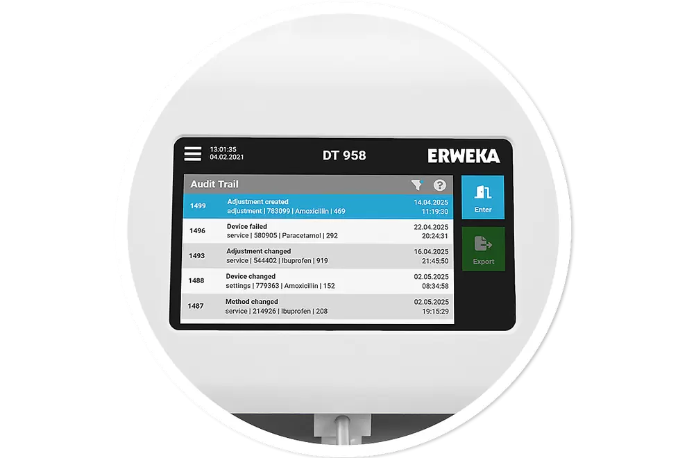 The ERWEKA DT 950 / DT 9510 is developed to meet the requirements for compliance and data management for modern laboratories. Its integrated Audit Trail records all user and system actions in detail, including user, time stamp, event, reason for changes, and parameter modifications with old and new values, ensuring complete traceability.