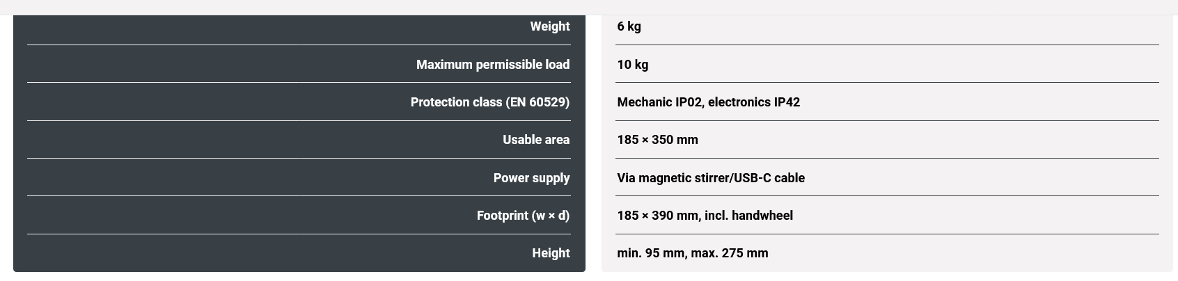 Experience comfort and stability with the electric lab jack; the e-Lift. The precisely designed plate (190 mm x 400 mm) ensures that your magnetic stirrer remains steady and secure, without any wobbling or slipping. The e-Lift includes a manual winch for easy adjustments and an attachment for additional support rods, providing extra stability for your setups. It features a height adjustment range from 100 mm to 275 mm, offering a vertical lift of 175 mm.