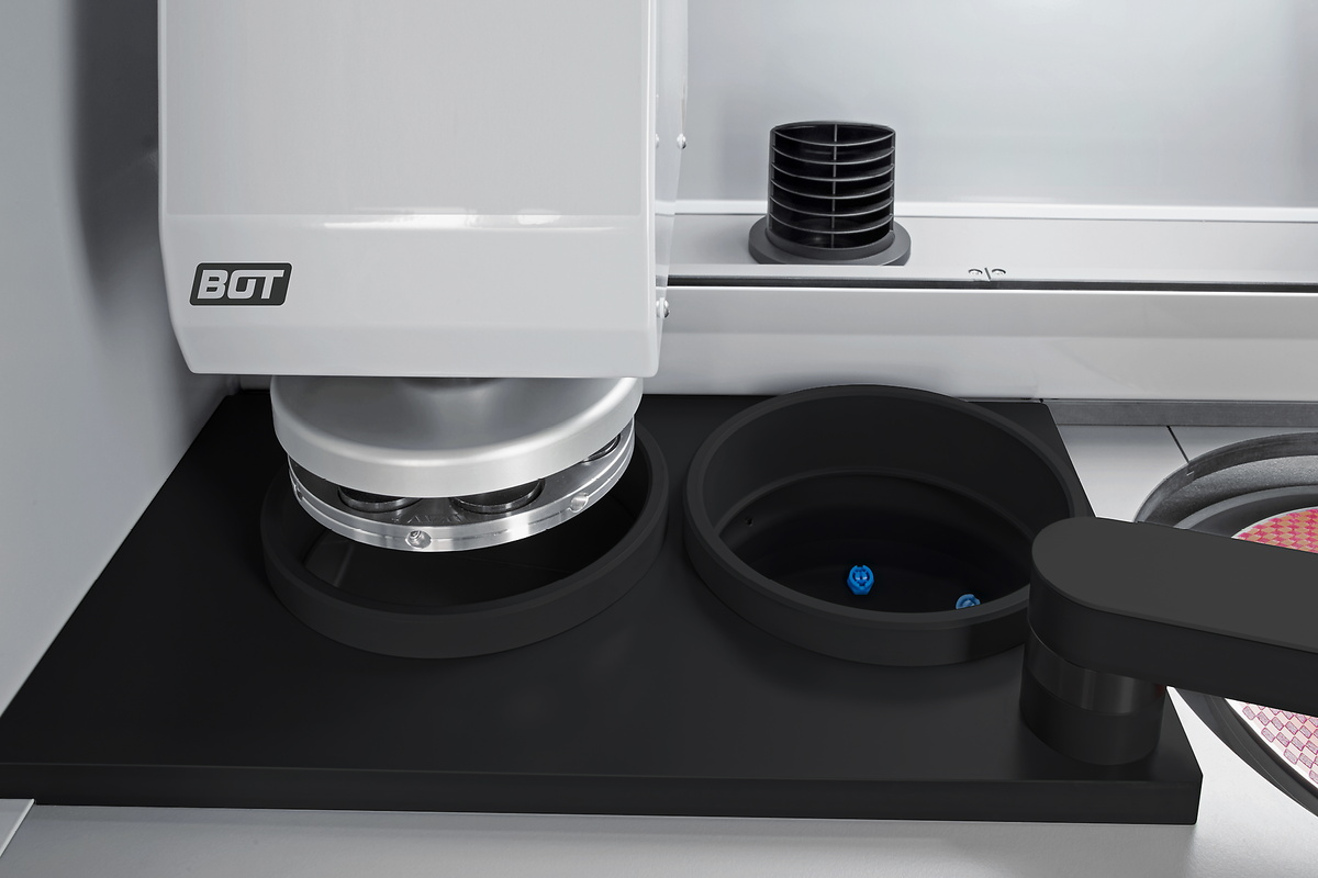 The compact fully automatic grinding and polishing robot Qpol 250 BOT combines the complete grinding and polishing process, including ultrasonic cleaning in one machine. 16x disc changer, 6x dosing unit and an integrable sedimentation tank fits perfectly into the System lab.