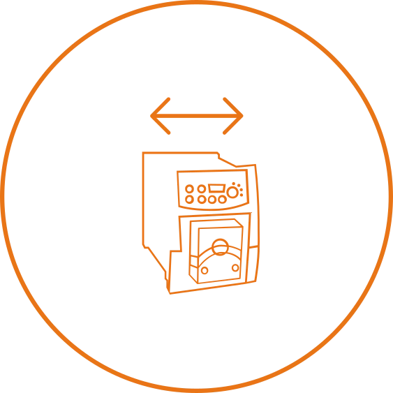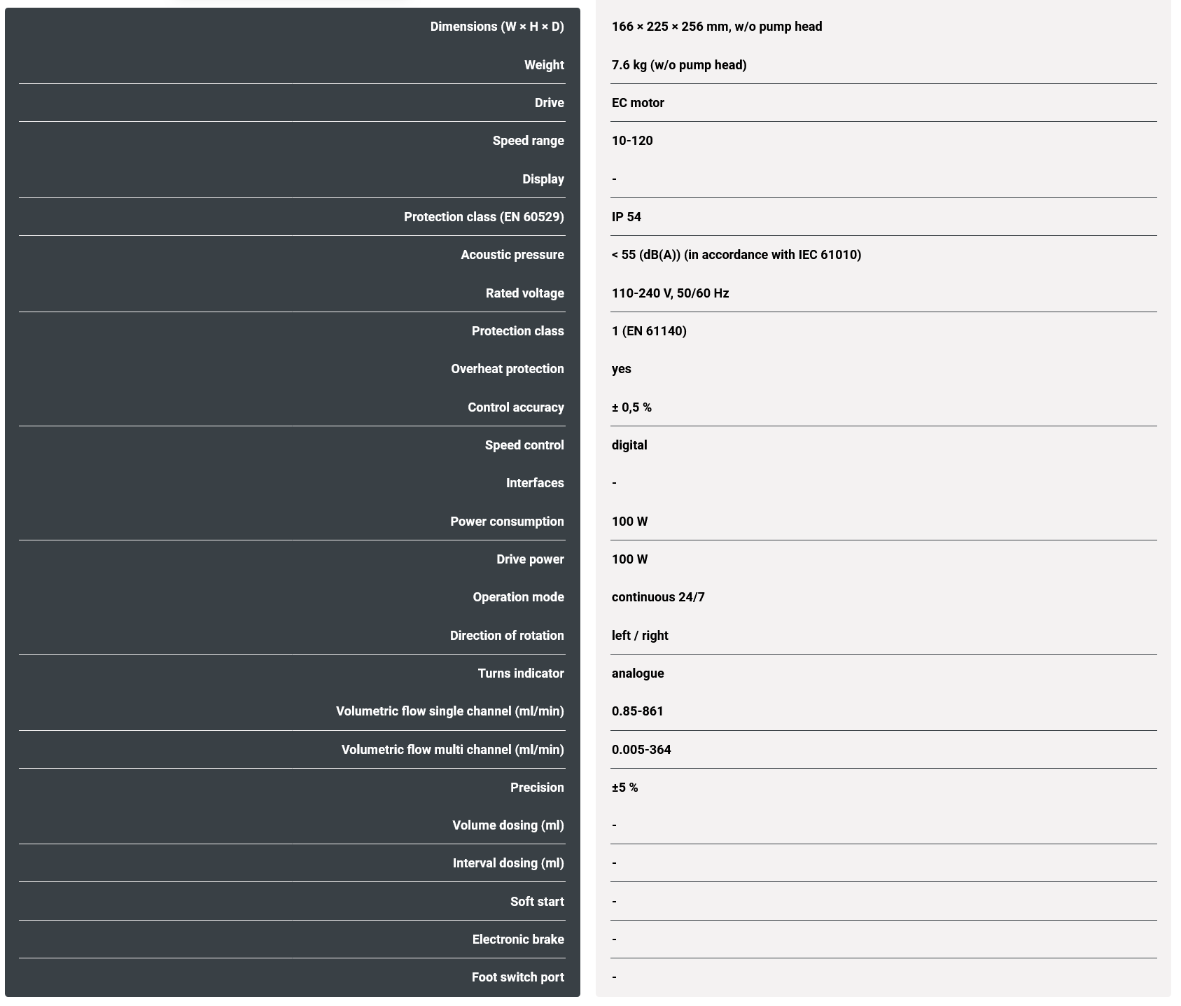 Depending on the adapted pump head, a flow rate of 0.83 – 861 ml/min for the single-channel and 0.005 – 364 ml/min for the multi-channel pump head is guaranteed. The Core 120 conveys with a control accuracy of ± 5% at a speed range of 10 – 120 rpm.
