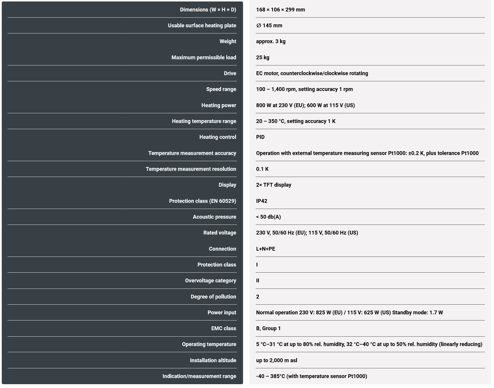 Separate timer functions for heating and stirring allow a reproducible and semi-automatic way of working. Programmable stirring and heating profiles (via software) optimize the specific use case and are complemented by the variable start-up behavior and the clockwise/counter-clockwise rotation as movement pattern for poorly soluble substances.