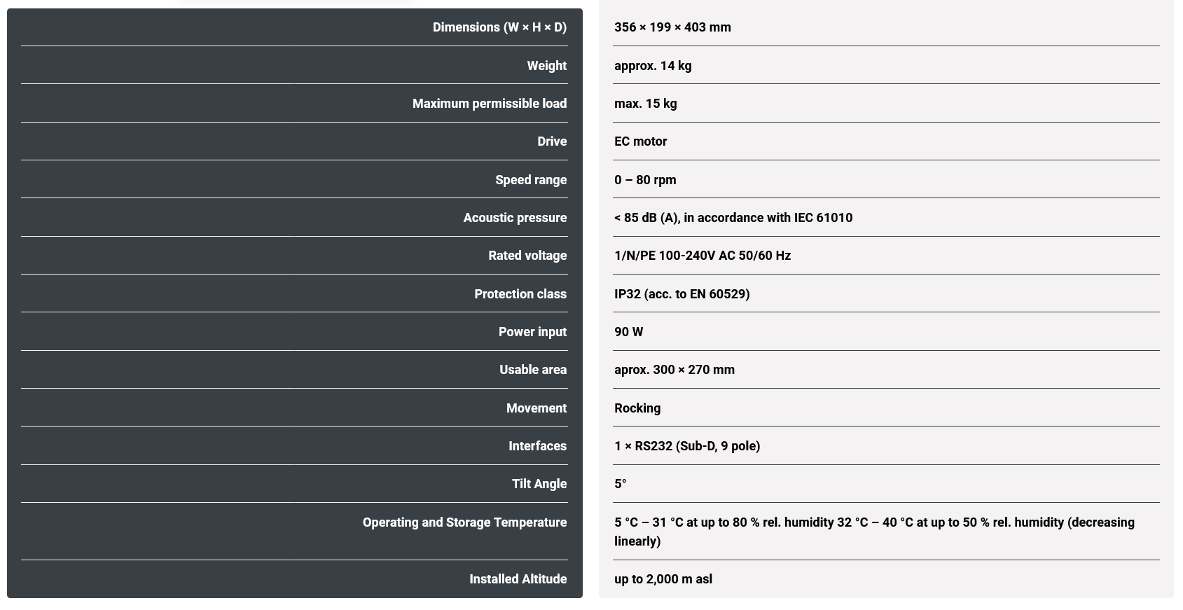 Thanks to the 2D-rocking movement and a speed range of 1 – 80 rpm, more vigorous but continuously gentle shaking of the samples is ensured. Containers are safely fixed on the anti-slip rubber mat even at high speeds.
