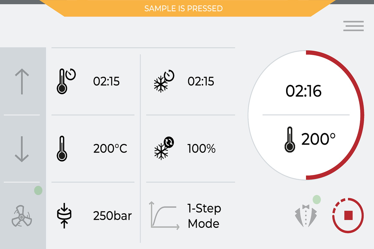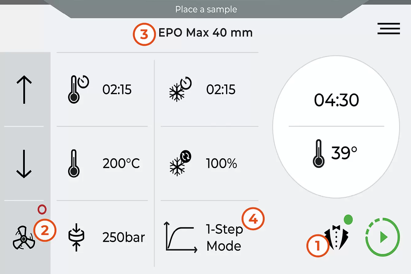 The intuitive software with a modern interface displays all important mounting parameters on the robust 7″ industrial touchscreen. Here, you can set the heating and cooling times, desired cooling capacity, temperature, and press mould pressure. Additionally, the software displays the current status of the hot mounting press. User Account Control allows settings to be write-protected.