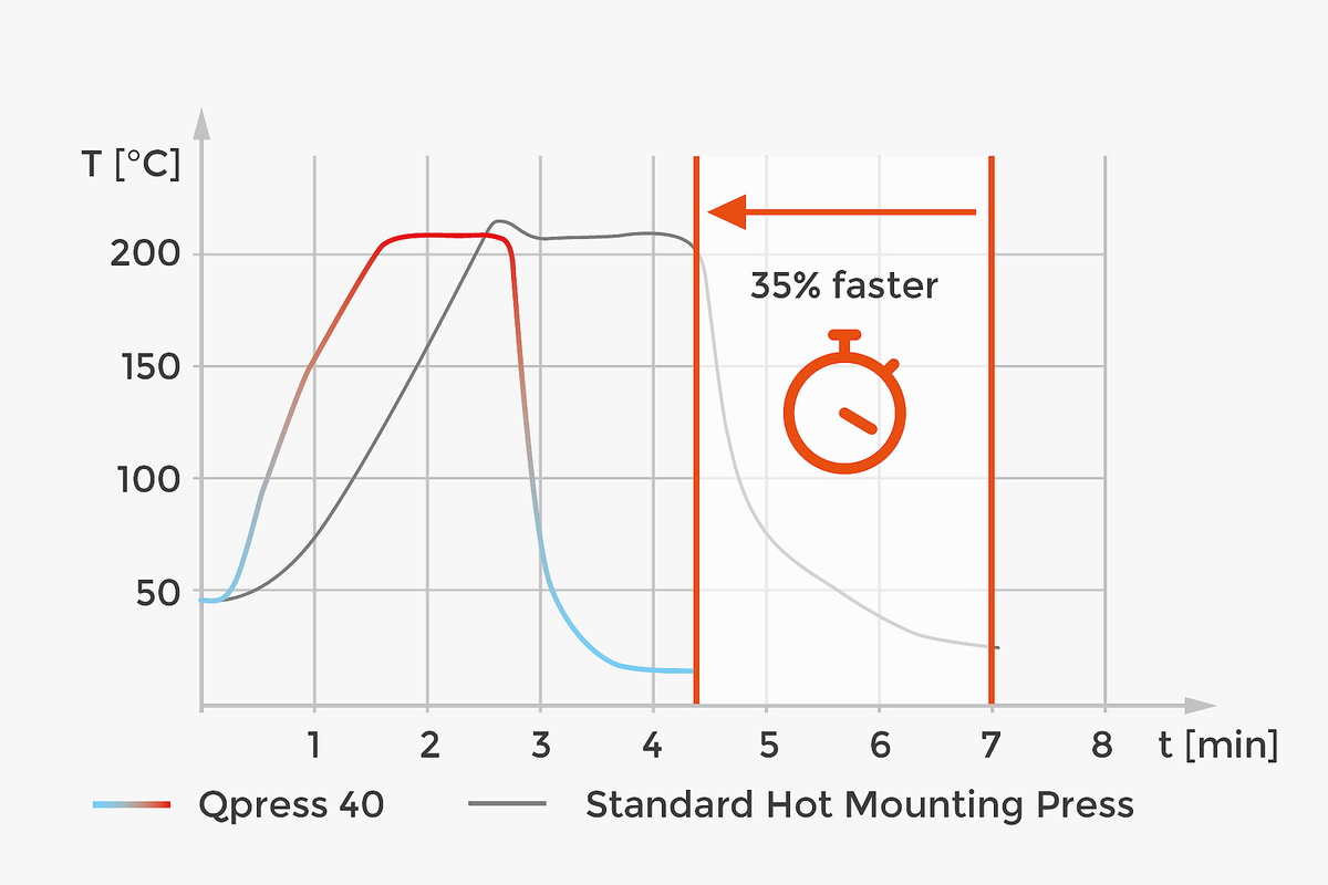 The new design of the Qpress 40 ensures the shortest possible heating and cooling times. The heating elements quickly melt the mounting resin thanks to optimized heat transfer and temperature control in the mould. During this process, the granules are compressed to the preset mould pressure. Once the set temperature is reached, the press mould is cooled as quickly as possible after a short holding time, allowing the hardened sample to be removed for further preparation. This not only saves time but also reduces energy requirements.