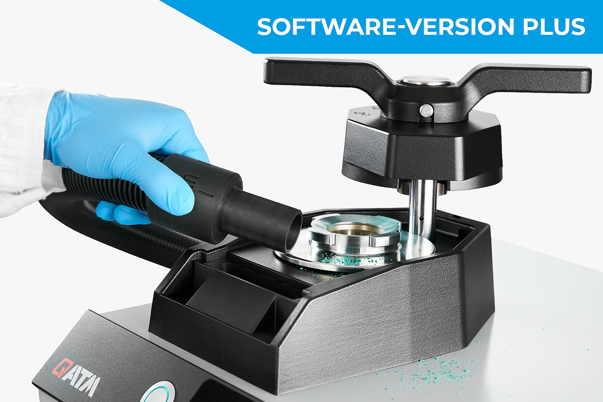 The optional extraction device allows for direct dust extraction when filling the mounting resin. It also enables easy cleaning of the machine with a removable suction hose. The extraction system can connect to up to two mounting machines and is controlled via the Qpress 40 software. It includes a replaceable vacuum cleaner bag and an additional fine dust filter.