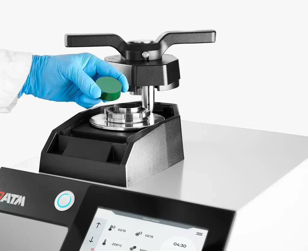 For sensitive samples (sheets, thin-walled pipes, coated materials), a 2-step mode can be activated permitting independent control of temperature and pressure. For example, in the first stage, the mounting resin melts at low press chamber pressure. In the second stage, full pressure is applied for compaction, providing maximum protection for the sample.