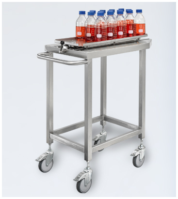 Large autoclaves in particular can be easily and securely loaded using special transport and transfer carts. The items to be sterilized can either be placed directly on the transfer cart with rails or using a basket. The transport cart can be moved and docked to the autoclave and fixed in position. The handle can then be loosened to allow the transfer cart to slide into the autoclave on fixed rails.