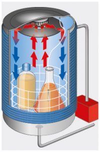 Liquids are also very slow to cool down, as, without active rapid cooling, temperatures within the chamber can only drop below 100 °C via a process of dissipating the built-up heat as radiation via the chamber insulation (see diagram: conventional cooling).