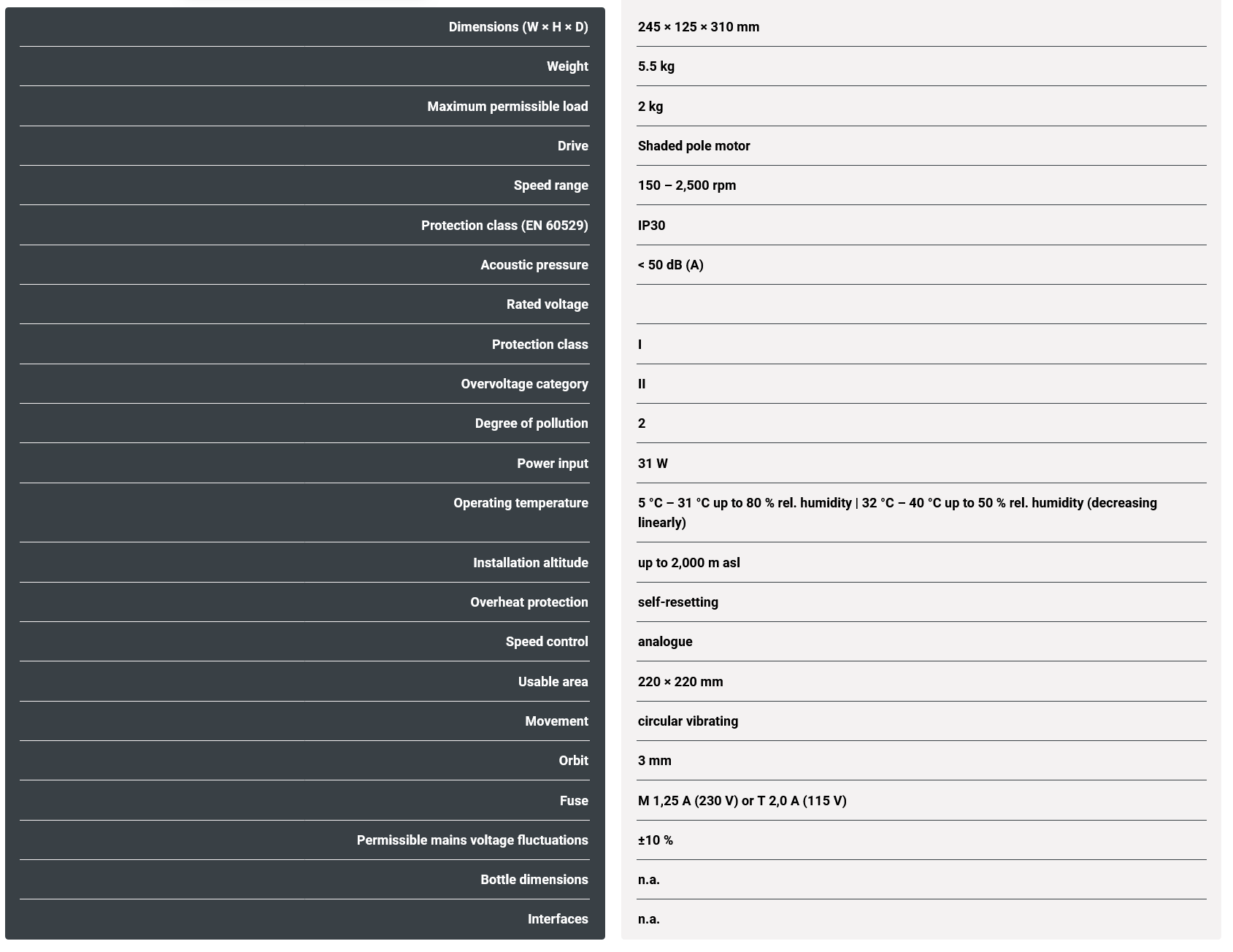 Due to the 3 mm orbit and the speed of 150 – 1,350 rpm, this circular vibrating shaker is ideal for suspending, for solubility studies and leaching studies.